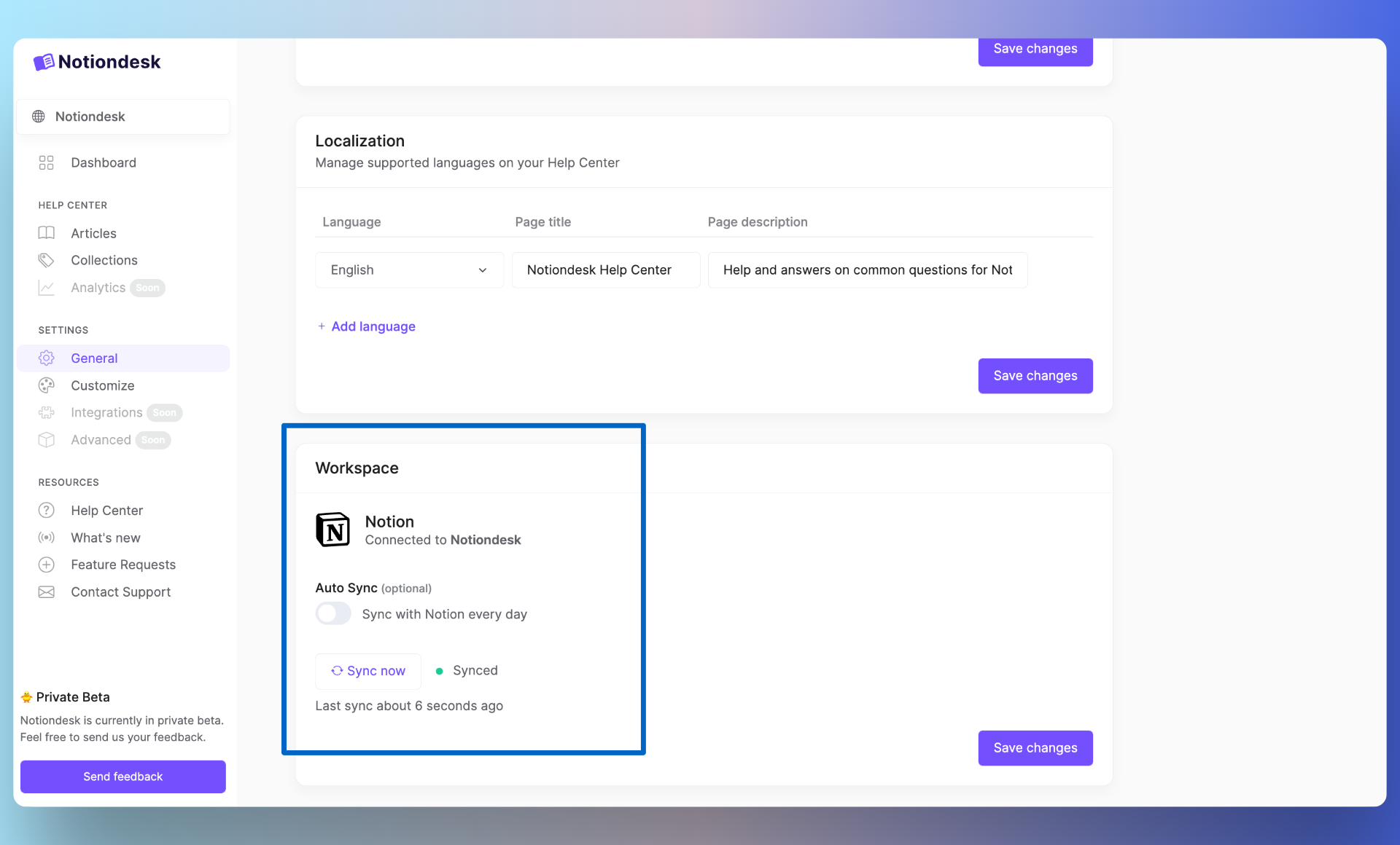 🎉 Vous pouvez gérer la synchronisation de votre centre d'aide depuis vos paramètres, soit une synchronisation automatique tous les jours, soit une synchronisation manuelle.
